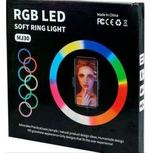 Approximately 13-inch (33 cm) ring light, equipped with RGB technology and a phone holder, with adjustable ambiance and lighting options according to your needs |